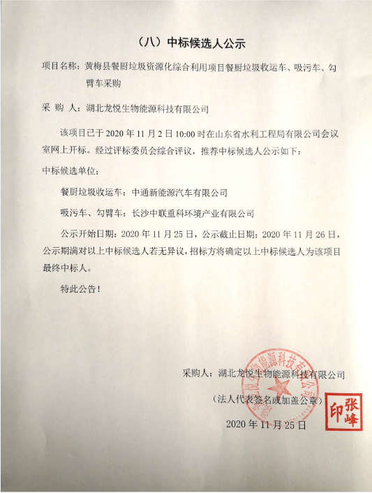 黃梅縣餐廚垃圾資源化綜合利用項目餐廚垃圾收運車、吸污車、勾臂車采購中標候選人公示