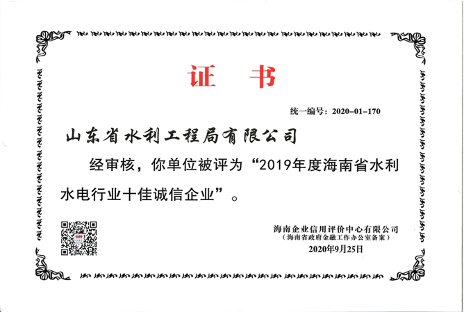 近日我公司再次獲得由海南省企業(yè)信用評價中心頒發(fā)的“2019年度海南省水利水電十佳誠信企業(yè)”和“信用等級AAA企業(yè)”兩項殊榮。 海南分公司自成立至今,已在海南省各地承接多項工程,憑借科學高效的管理理念,先進的施 ...